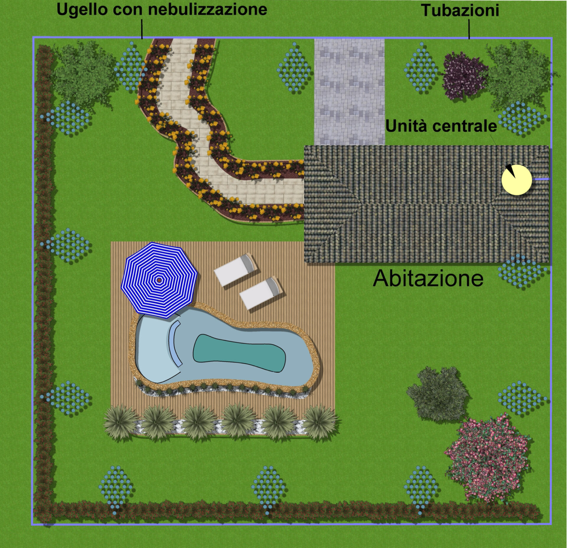 2) Posizioniamo lungo il perimetro del giardino la tubazione e gli ugelli.